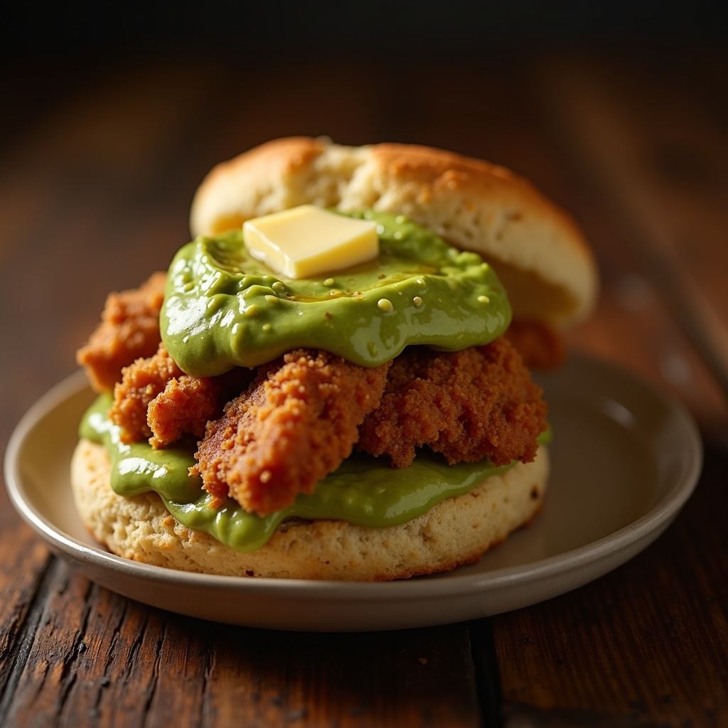 Flaky buttermilk biscuits split open, topped with creamy guacamole, crispy fried chicken, and a drizzle of honey butter. A hearty, savory-sweet start with a vibrant green guacamole twist.