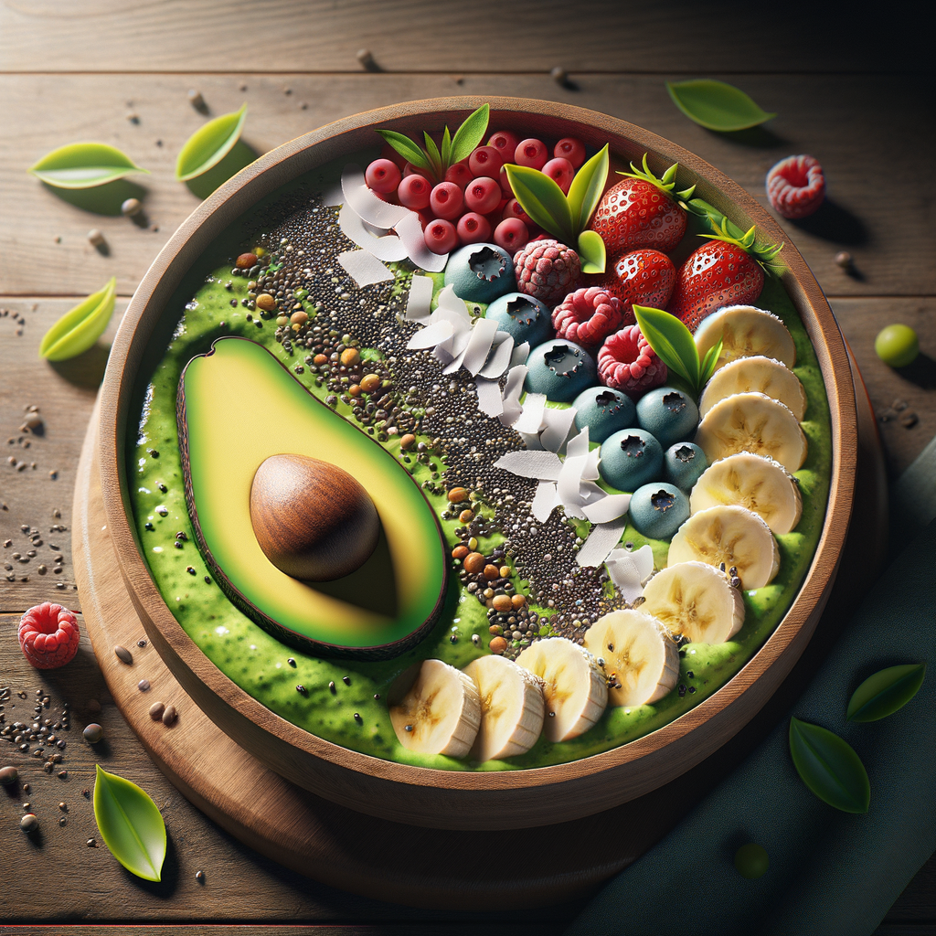 A delightful smoothie bowl blending avocado, bananas, and mixed berries, topped with chia seeds, coconut flakes, and a drizzle of honey, for a sweet yet healthy treat.