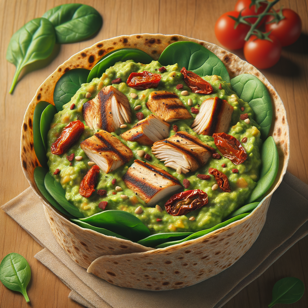 A whole wheat wrap filled with a lush layer of creamy guacamole, grilled chicken, spinach, and sun-dried tomatoes, offering a perfect balance of protein and freshness.