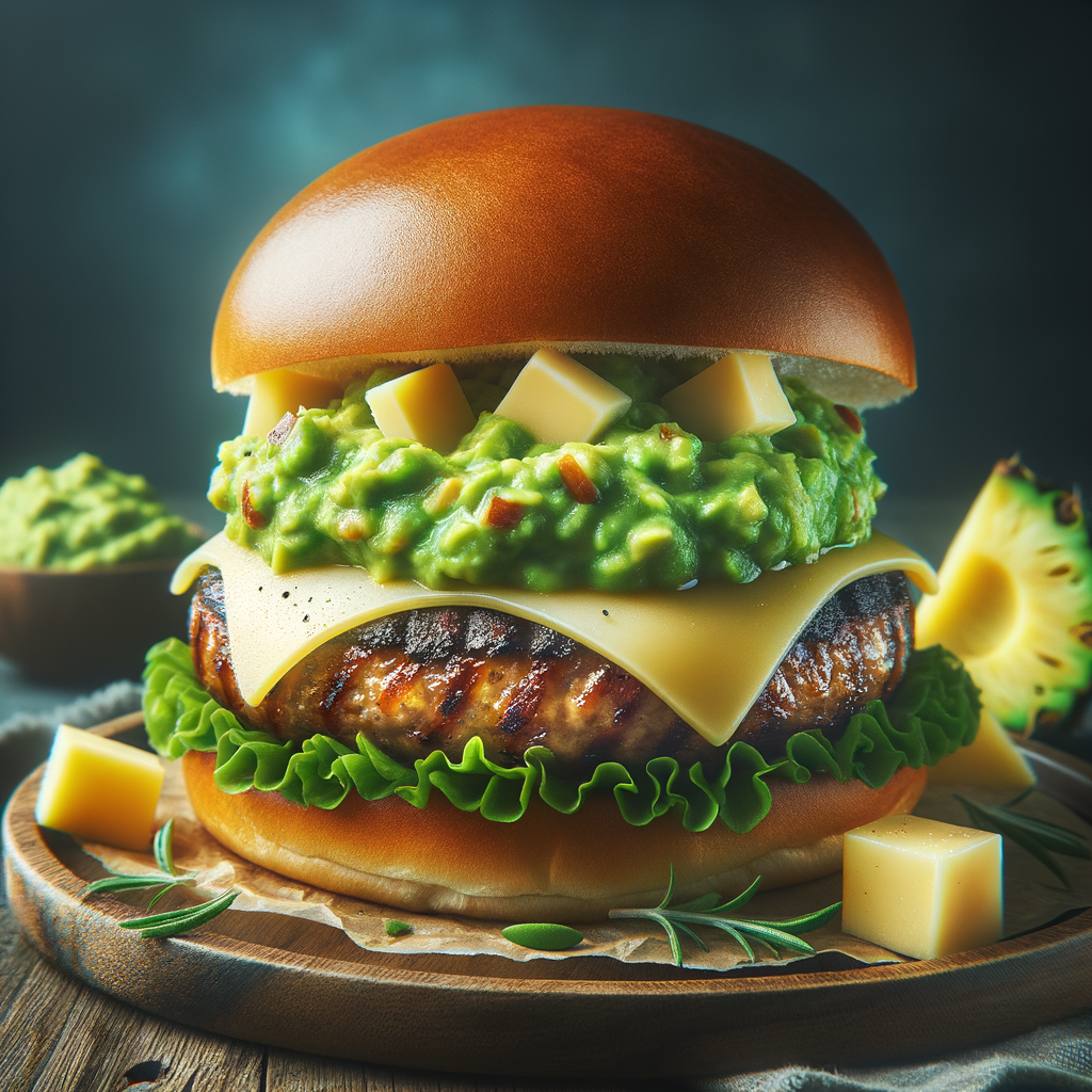 A juicy grilled burger patty topped with a generous dollop of rich, house-made guacamole, melted Monterey Jack cheese, and a slice of fresh pineapple for a sweet and savory taste, all on a toasted brioche bun. This burger brings the essence of the islands to your table.