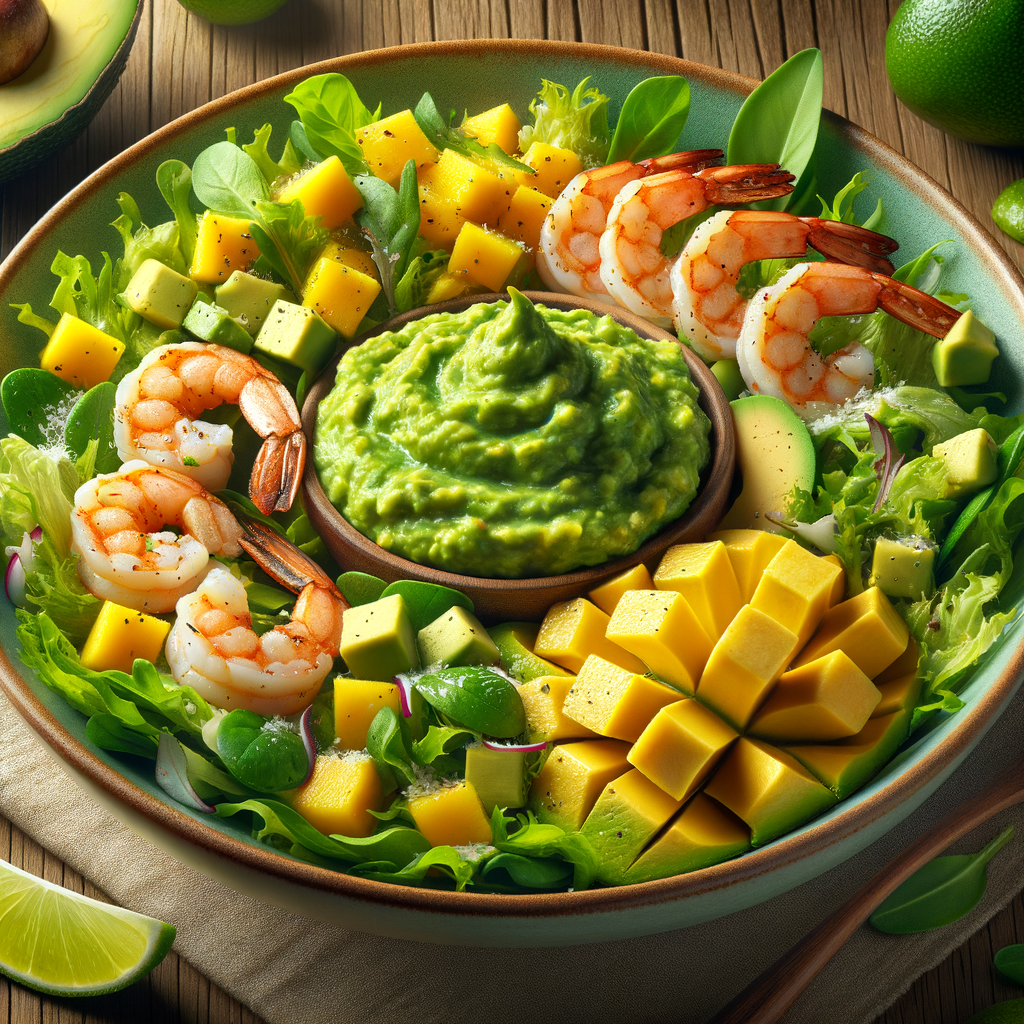 A light and healthy salad loaded with a medley of fresh greens, grilled shrimp and scallops, diced mango, and avocado, drizzled with a tangy avocado-lime dressing. The perfect blend of flavors to transport you straight to the beach.