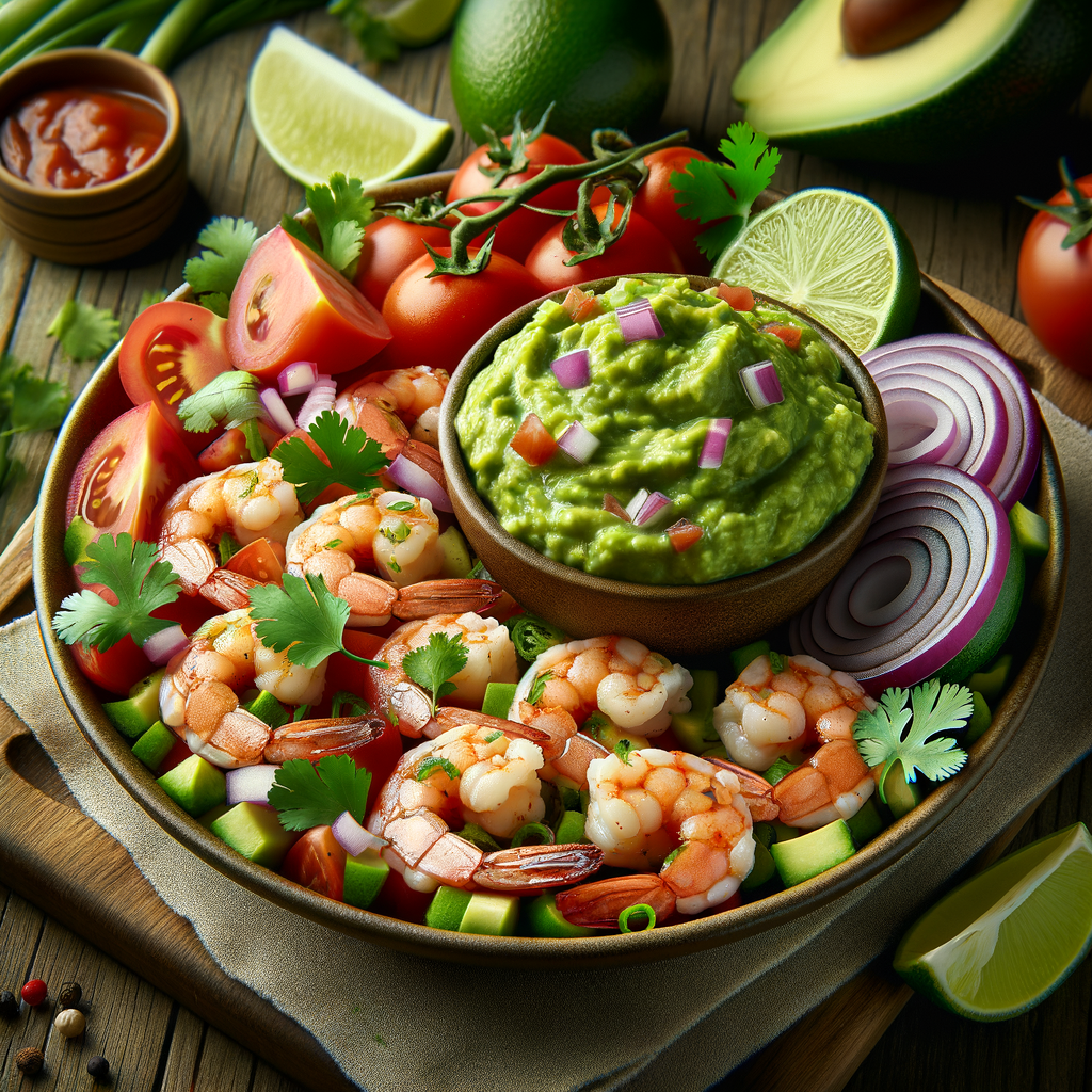 A refreshing appetizer featuring succulent shrimp marinated in zesty lime juice, tossed with fresh tomatoes, cilantro, and red onions, all served with a generous scoop of creamy guacamole on top. Perfect for starting a tropical dining experience.