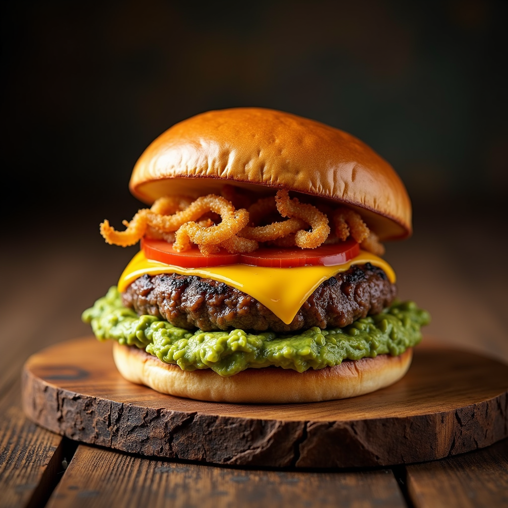 Juicy beef patty topped with melted Monterey Jack, crispy fried onions, and a generous helping of chunky, smoky chipotle guacamole. Served on a toasted brioche bun.