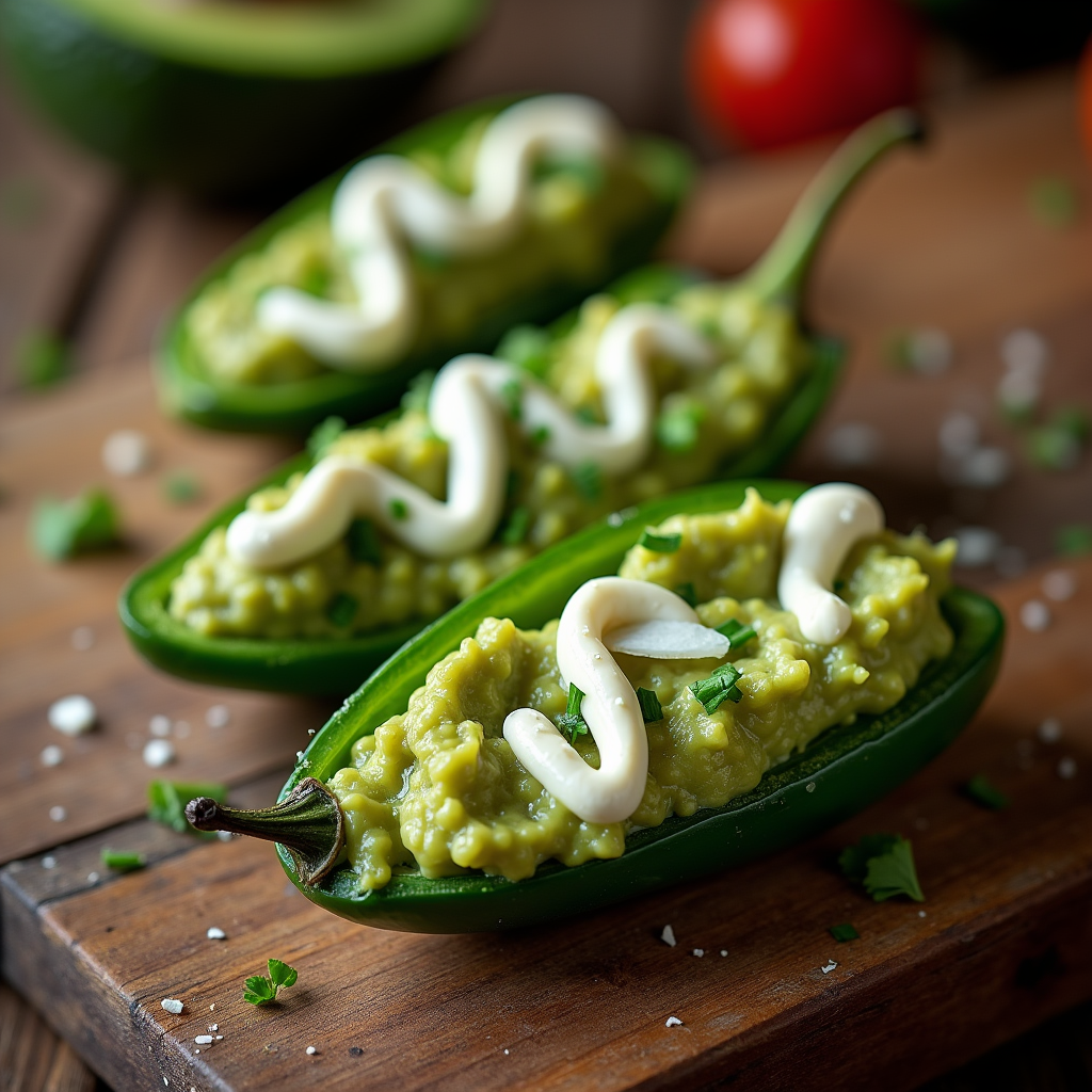 Spicy jalapeños halved and filled with creamy, tangy guacamole, topped with cotija cheese and a drizzle of cilantro-lime crema. A Tex-Mex explosion in every bite.
