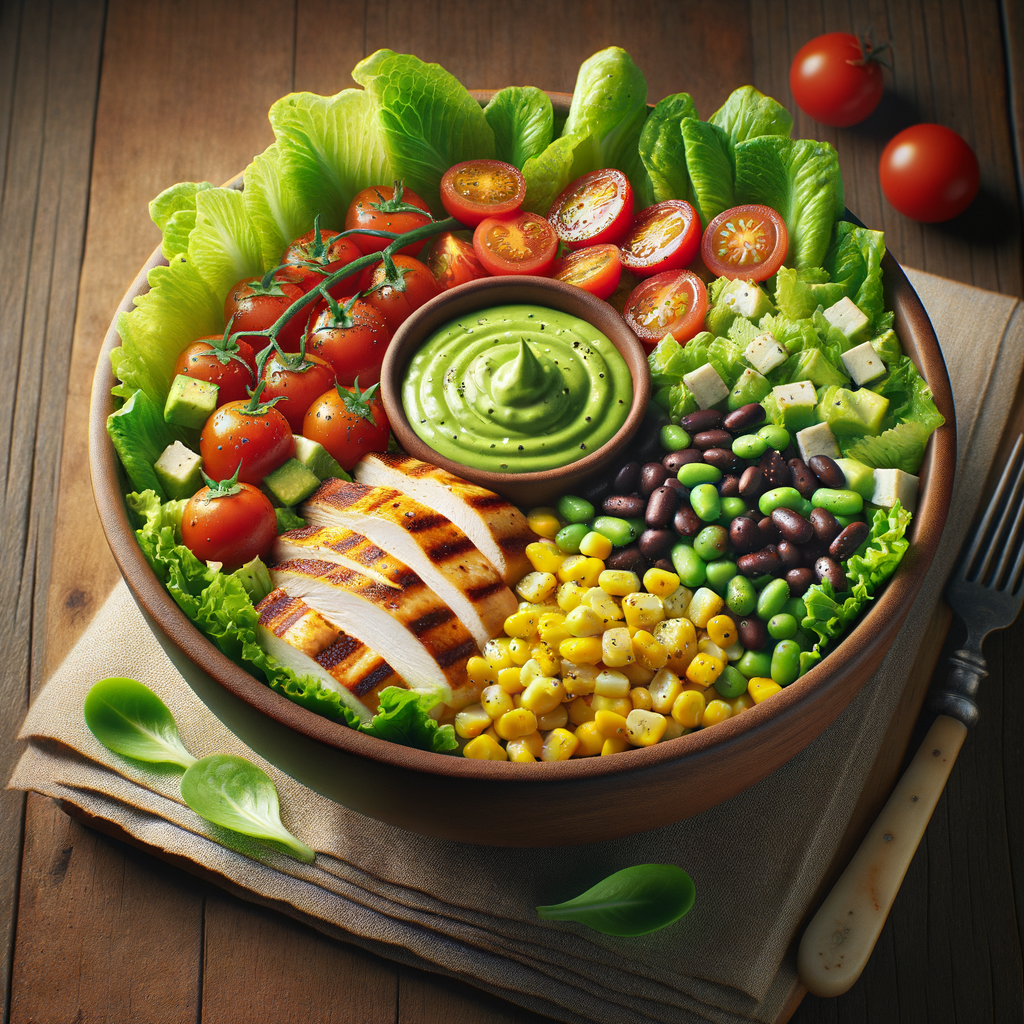 A fresh mix of romaine lettuce, cherry tomatoes, sweet corn, black beans, and grilled chicken strips, drizzled with a zesty avocado dressing.