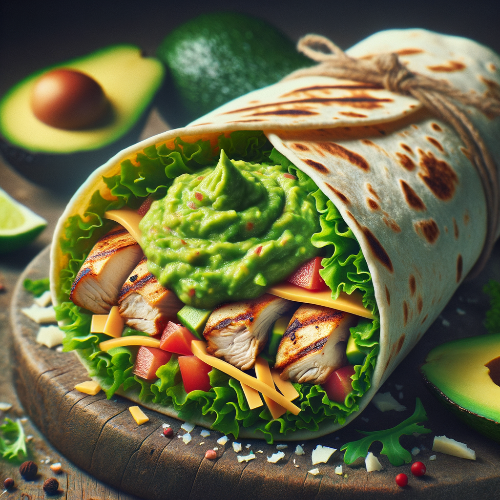 A grilled chicken wrap filled with crispy lettuce, diced tomatoes, shredded cheese, and a lavish spread of avocado dip, all wrapped in a warm flour tortilla.