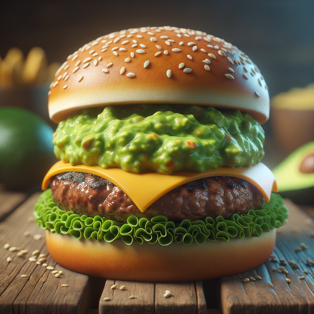 A twist on the classic cheeseburger, this burger features a juicy beef patty, a slice of melty cheddar cheese, and a generous dollop of creamy guacamole, all sandwiched between toasted sesame seed buns.
