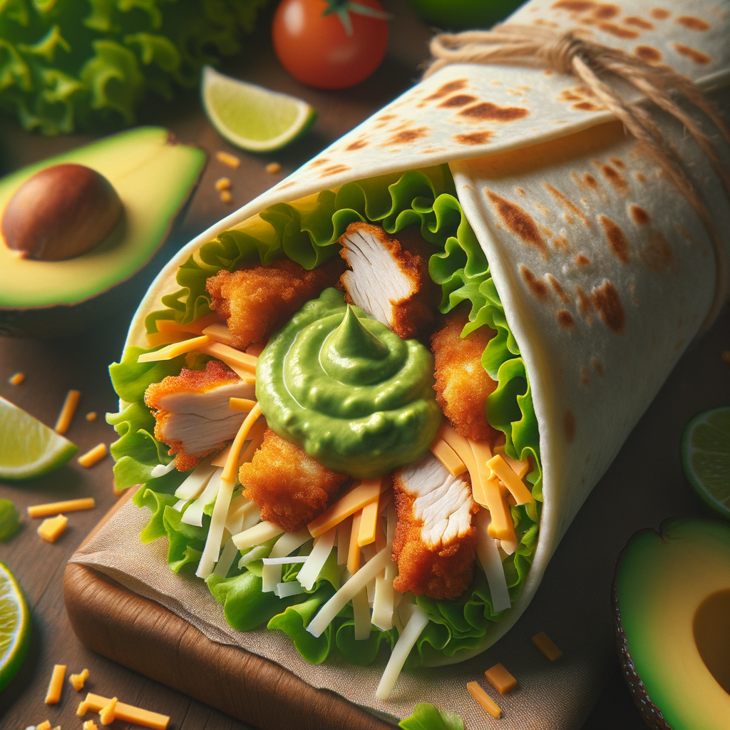 A hearty wrap filled with crispy chicken strips, fresh lettuce, shredded cheese, and a rich avocado dip, all wrapped up in a soft flour tortilla.