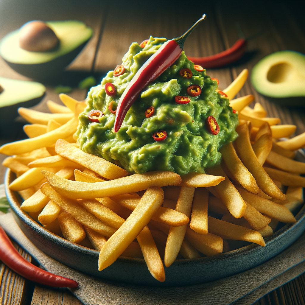 Crispy golden fries topped with spicy green chili and a luscious layer of mashed guacamole, creating the perfect fusion of heat and creaminess.