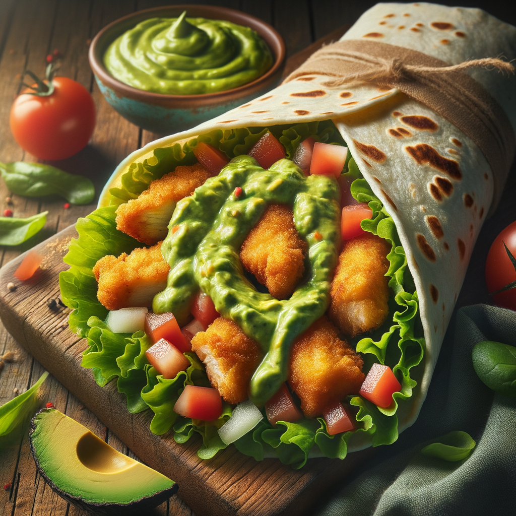 A warm flour tortilla filled with crispy chicken tenders, fresh romaine lettuce, diced tomatoes, and a splash of avocado dressing, rolled up for a convenient on-the-go meal.