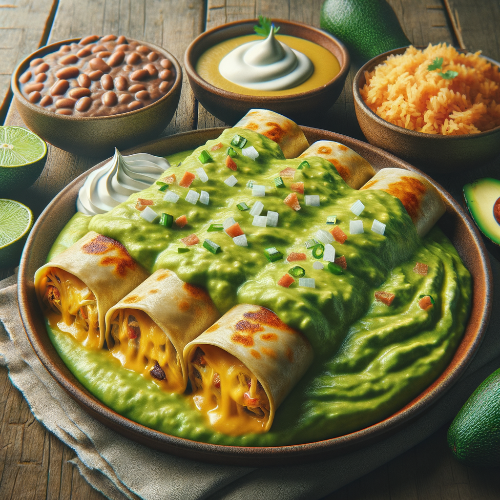 A hearty platter of enchiladas stuffed with a blend of cheeses and onions, smothered in a rich avocado sauce made from smoothly blended guacamole, garnished with sour cream and served with a side of Spanish rice and refried beans.