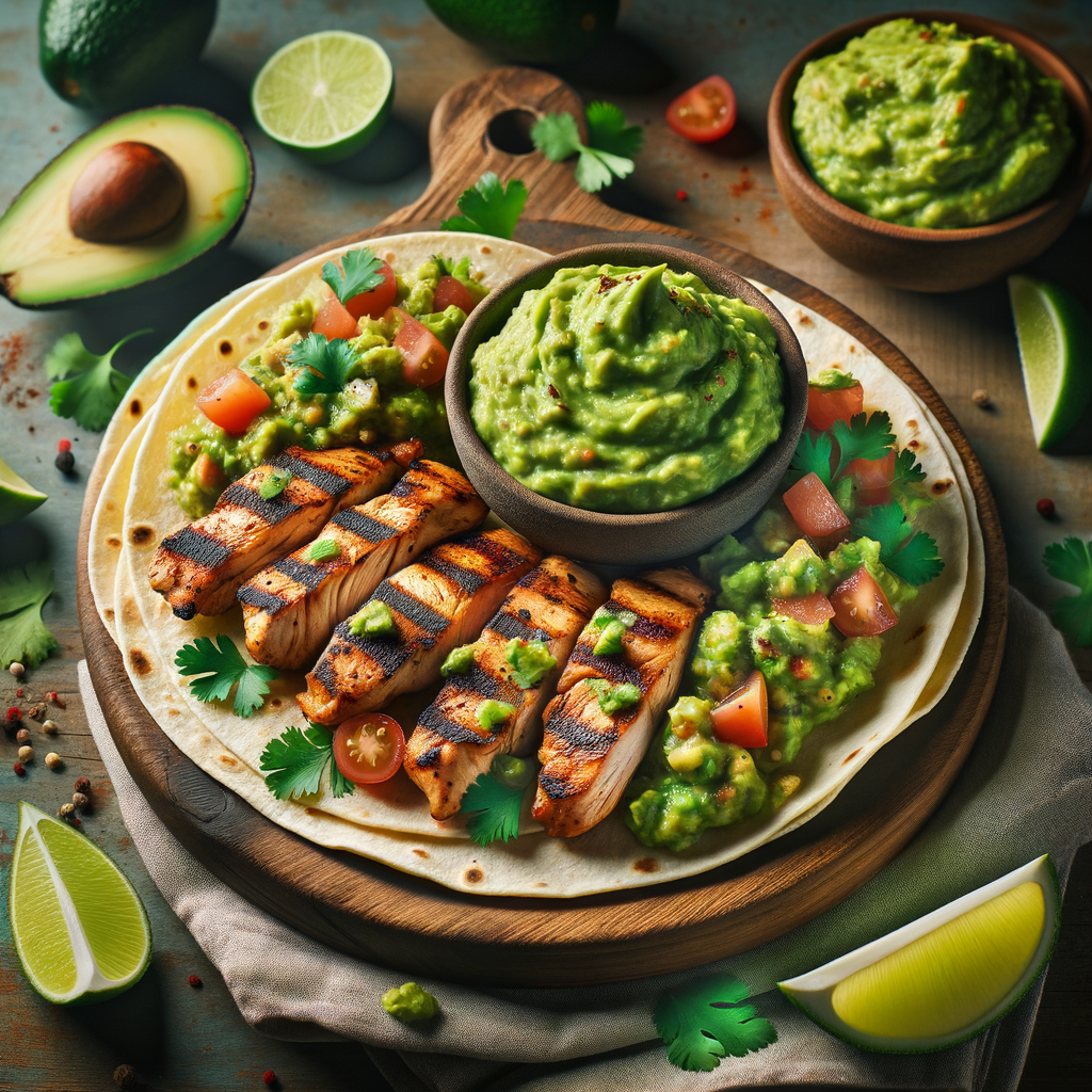 Succulent grilled chicken strips topped with a generous dollop of zesty guacamole, wrapped in soft corn tortillas and sprinkled with fresh cilantro and diced tomatoes. This dish marries the smoky flavor of the grill with the creamy richness of avocado.