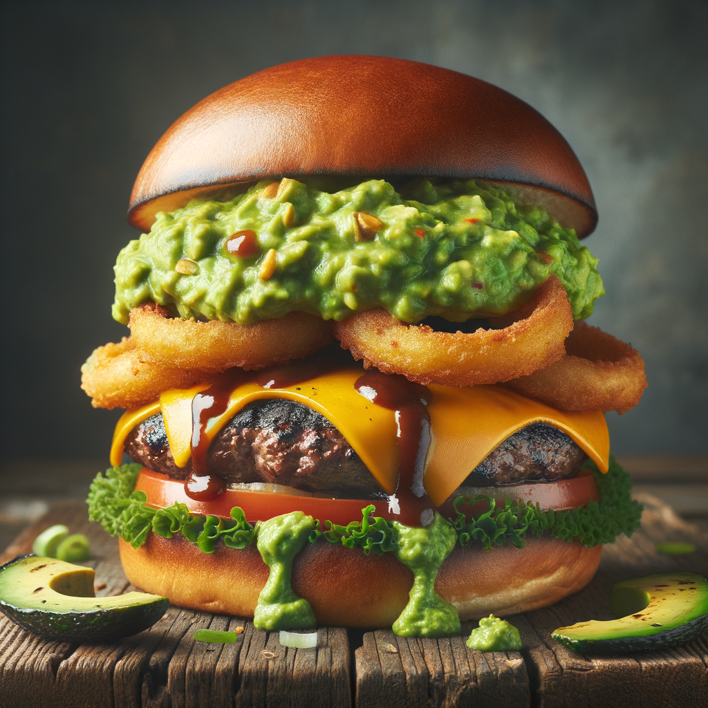 A juicy grilled beef patty topped with a hearty dollop of rich, smoky guacamole, melted cheddar cheese, crispy onion rings, and a tangy barbecue sauce, all nestled between a toasted brioche bun.