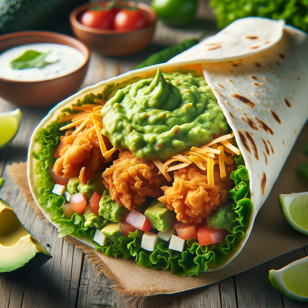 Tender strips of crispy fried chicken wrapped in a soft flour tortilla with a generous spread of creamy guacamole, fresh lettuce, diced tomatoes, and shredded cheese, served with a side of ranch dressing.