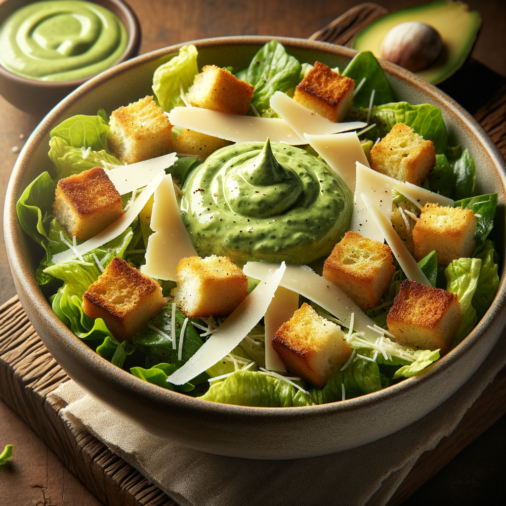 A classic Caesar salad topped with homemade croutons, Parmesan shavings, and a dollop of rich avocado Caesar dressing, blending the traditional Caesar flavors with the luxurious smoothness of avocado.