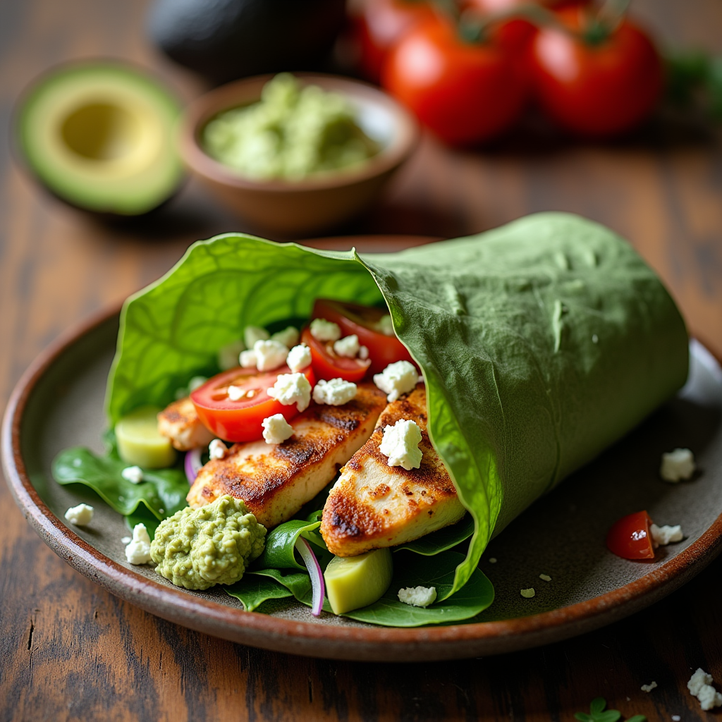 Grilled lemon-herb chicken breast wrapped in a spinach tortilla with romaine lettuce, diced tomatoes, red onion, feta cheese, and a generous smear of fresh guacamole. A healthy, satisfying lunch.