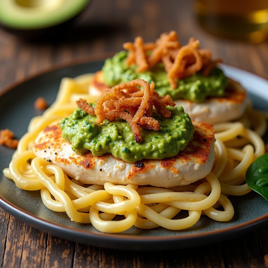 Chicken breasts filled with a zesty guacamole, nestled on a bed of fettuccine Alfredo. Topped with crispy fried onions for a satisfying crunch and creamy contrast.