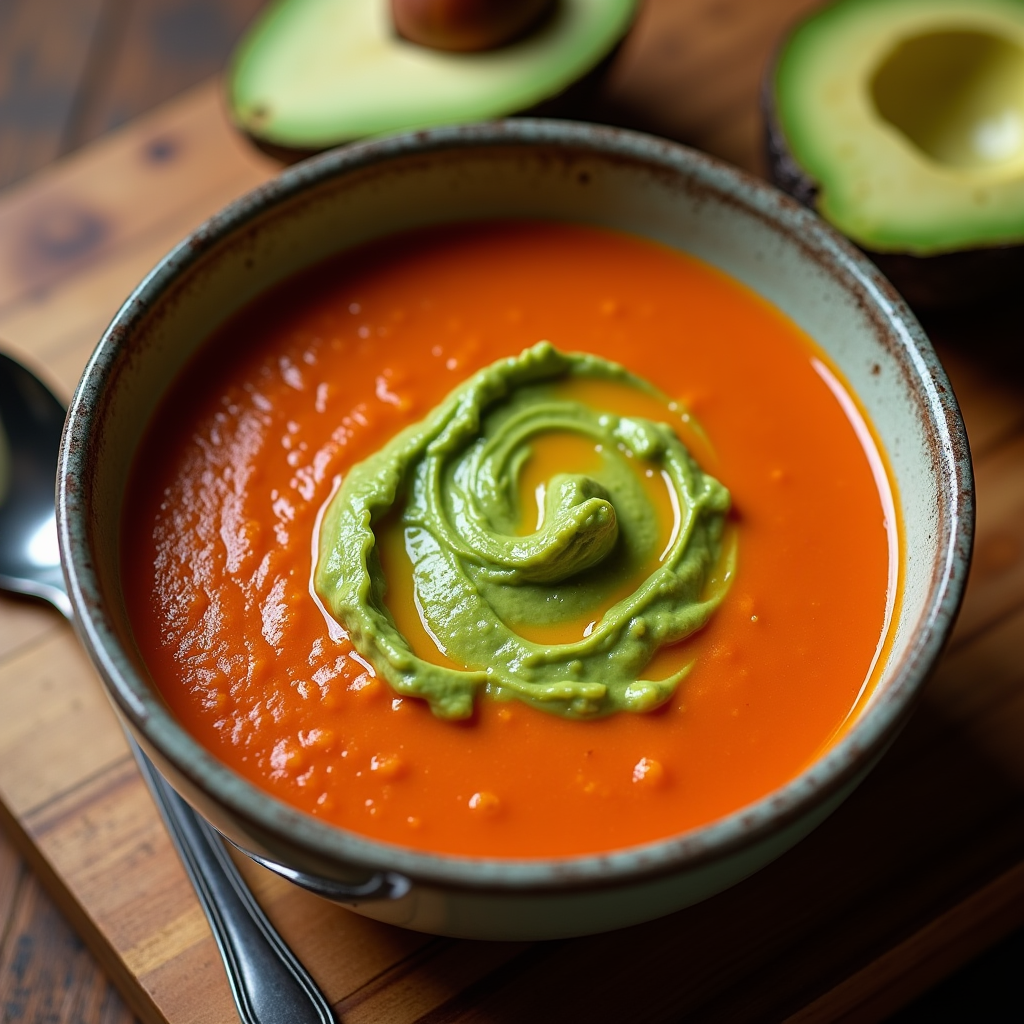 Creamy tomato soup gets a cool, fresh twist with a swirl of vibrant guacamole. The contrasting temperatures and flavors create a comforting yet invigorating lunch experience.