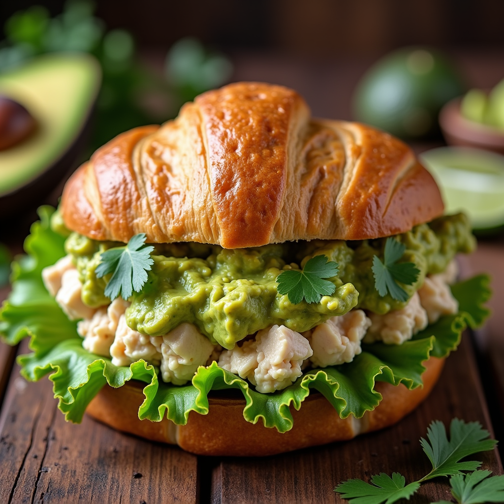 Flaky croissant filled with creamy chicken salad, brightened with a vibrant guacamole. Cilantro and lime enhance the avocado's richness. A textural delight with crisp lettuce.