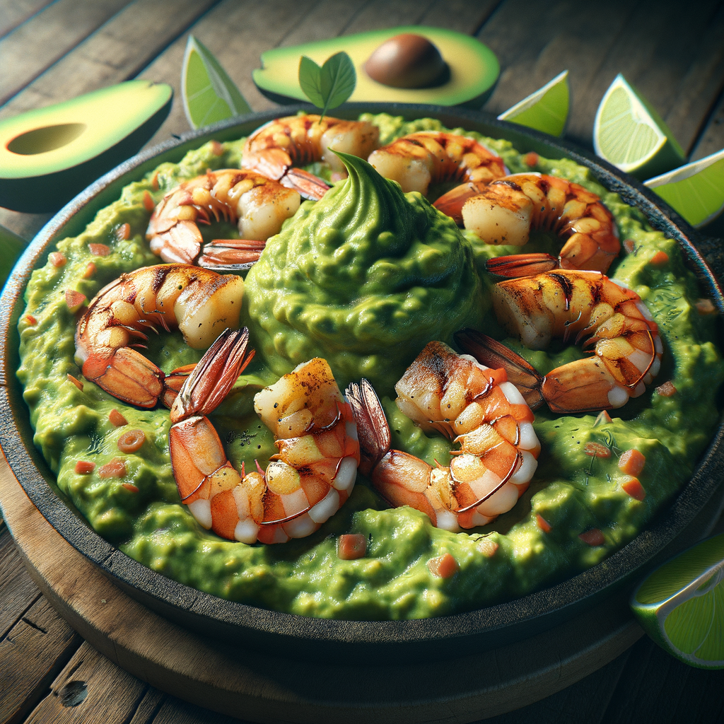 Juicy grilled shrimp served on a bed of zesty guacamole, made with ripe avocados, tomatoes, onions, cilantro, and a squeeze of lime, presented on a sizzling hot plate.