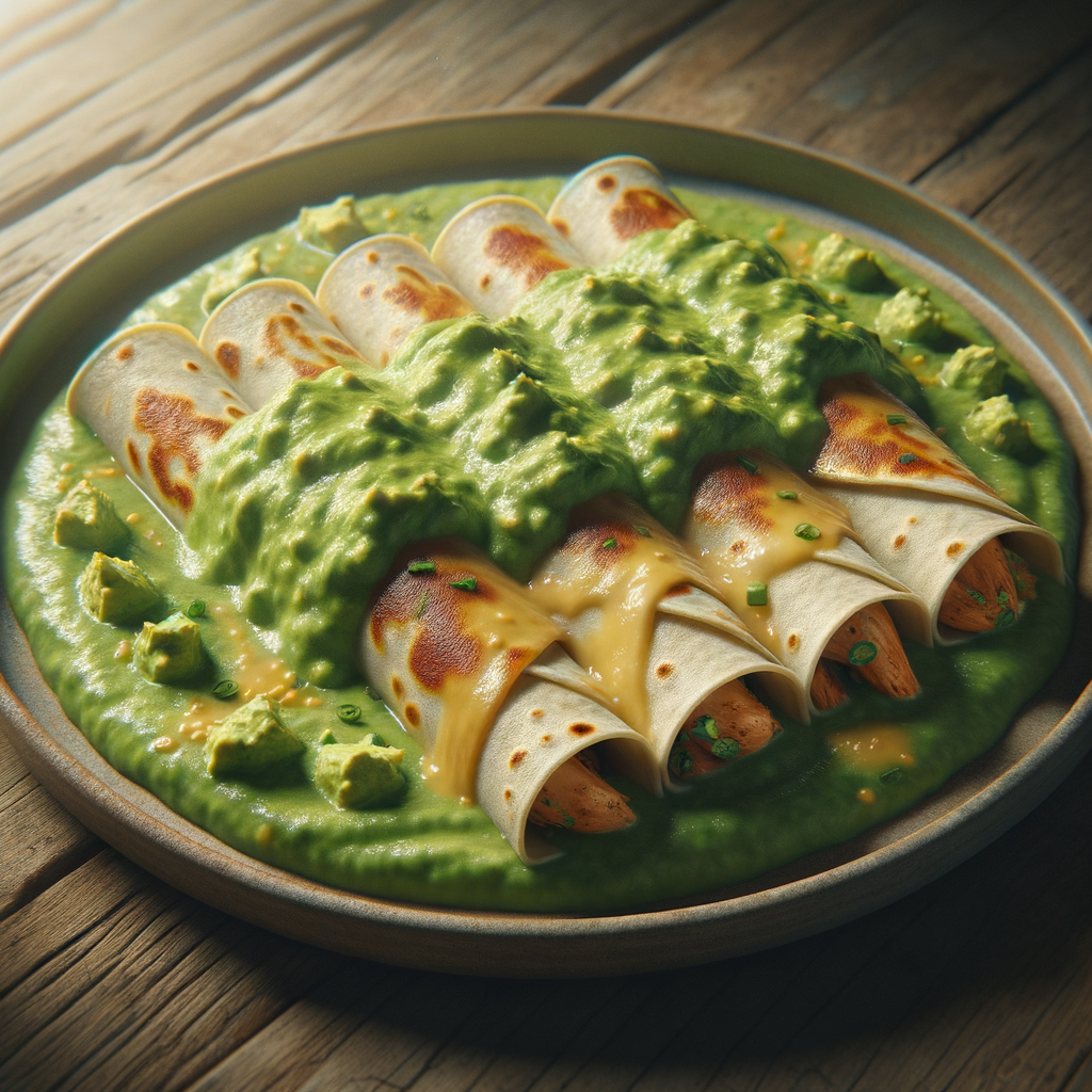 Soft corn tortillas stuffed with a mix of seasoned chicken and cheese, topped with a rich avocado sauce, baked to perfection, and garnished with fresh cilantro and diced tomatoes.