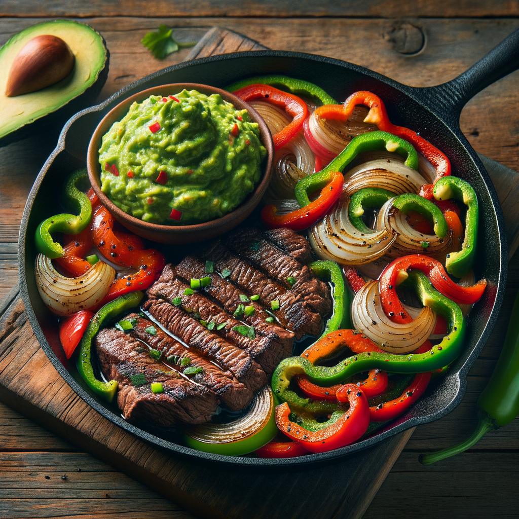 A hot skillet filled with tender strips of marinated steak, sautéed bell peppers, and onions, accompanied by a side of smooth guacamole for spreading or dipping.