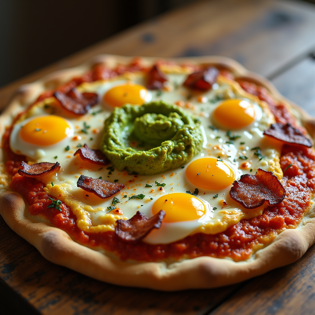 A crispy thin-crust pizza topped with scrambled eggs, crumbled bacon, mozzarella, and a vibrant swirl of creamy guacamole. A zesty breakfast delight.