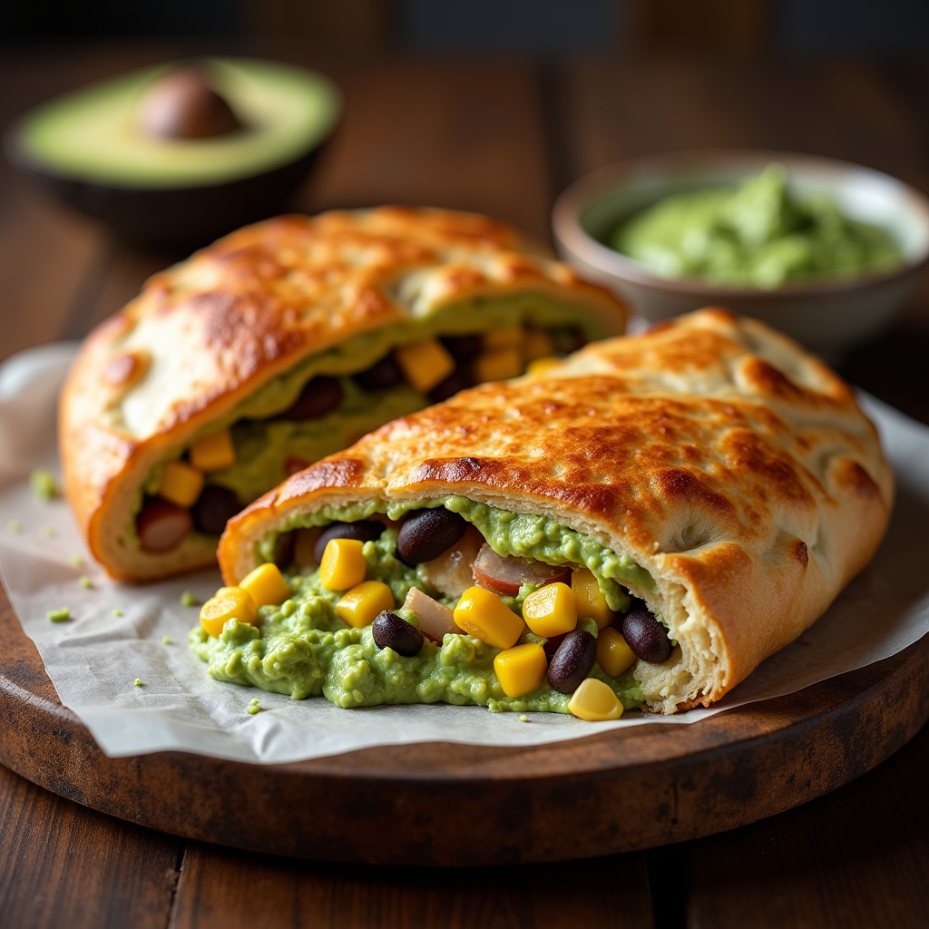 A savory calzone filled with grilled chicken, black beans, corn, cheddar cheese, and a smoky chipotle guacamole. Baked to golden perfection and served hot.