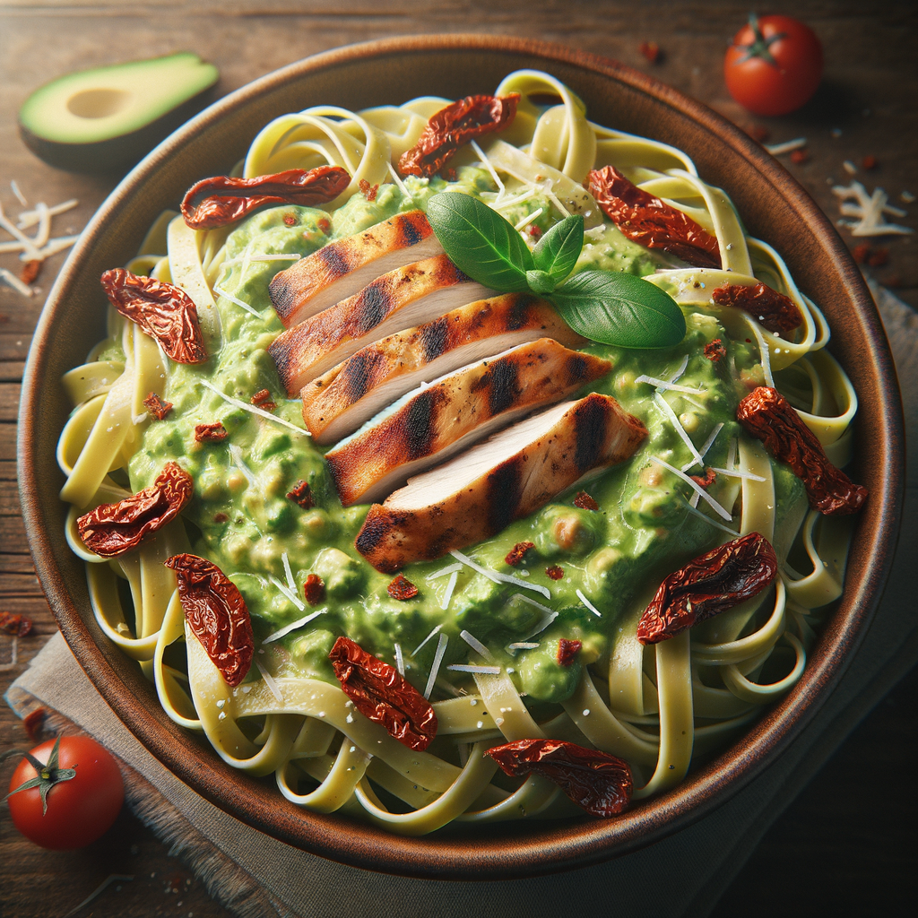 A sumptuous blend of classic Italian and modern flavors, this dish features al dente fettuccine tossed in a rich avocado Alfredo sauce, garnished with grilled chicken strips, sundried tomatoes, and a sprinkle of Parmesan.