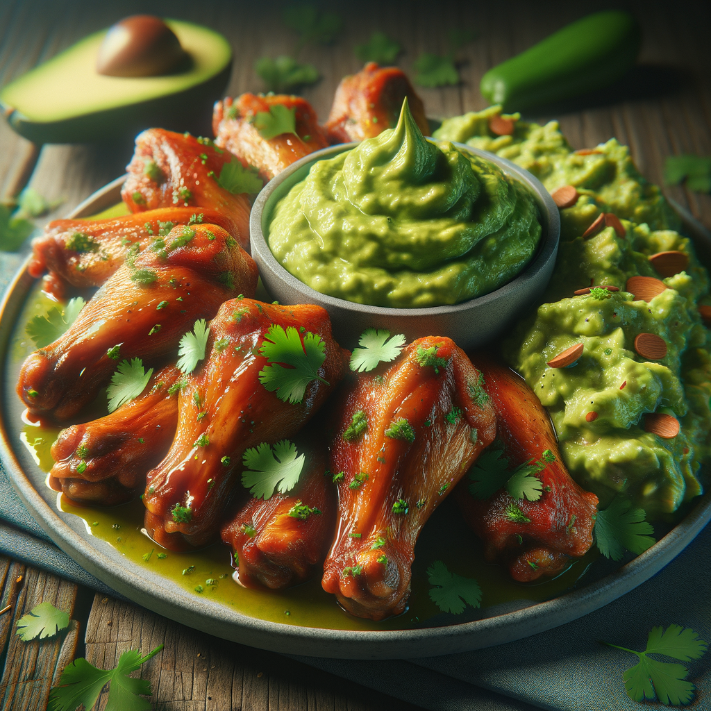 A tangy and mouthwatering appetizer, these crispy chicken wings are smothered in a spicy avocado dip sauce, served with a side of cool guacamole for dipping and a sprinkling of fresh cilantro.