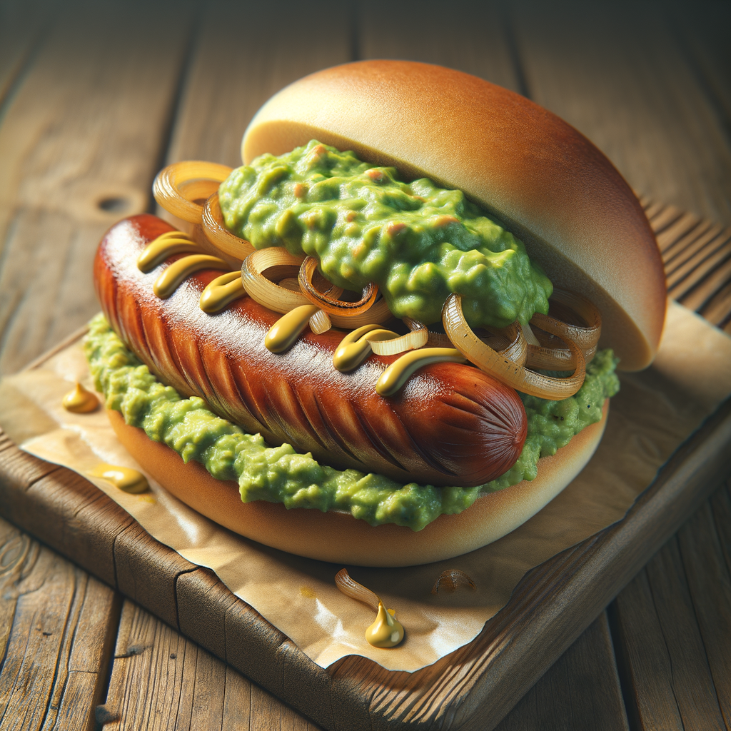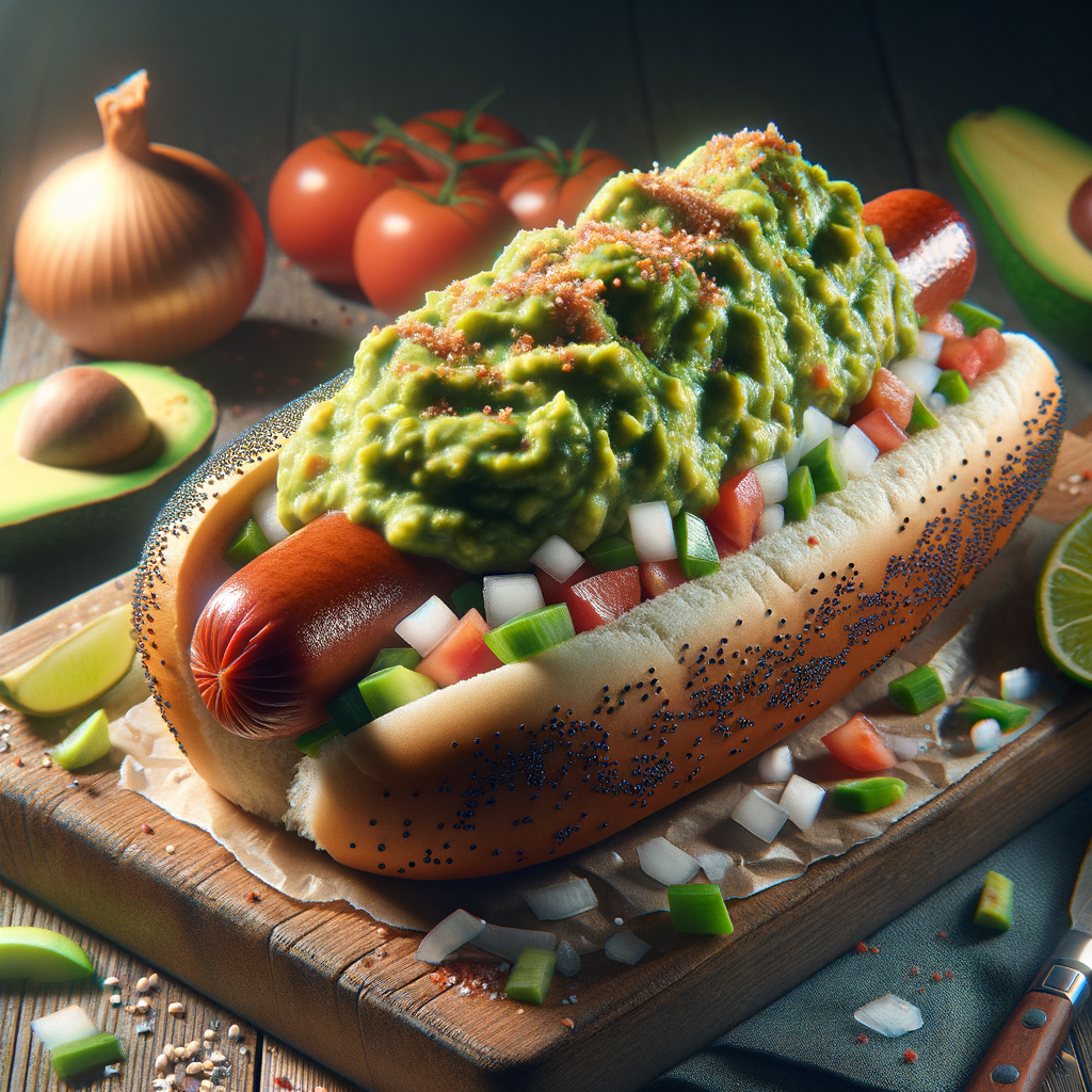 A twist on the classic Chicago-style hot dog, featuring a steamed poppy seed bun filled with an all-beef hot dog, topped with a generous spread of creamy guacamole, diced onions, tomatoes, and a sprinkle of celery salt.