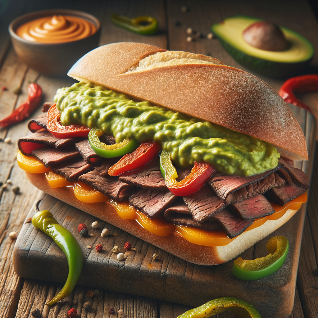Portillo's Italian beef sandwich reimagined with thin slices of tender roast beef dunked in savory au jus, layered with roasted bell peppers, and smothered in a rich avocado aioli on a toasted Italian-style roll.