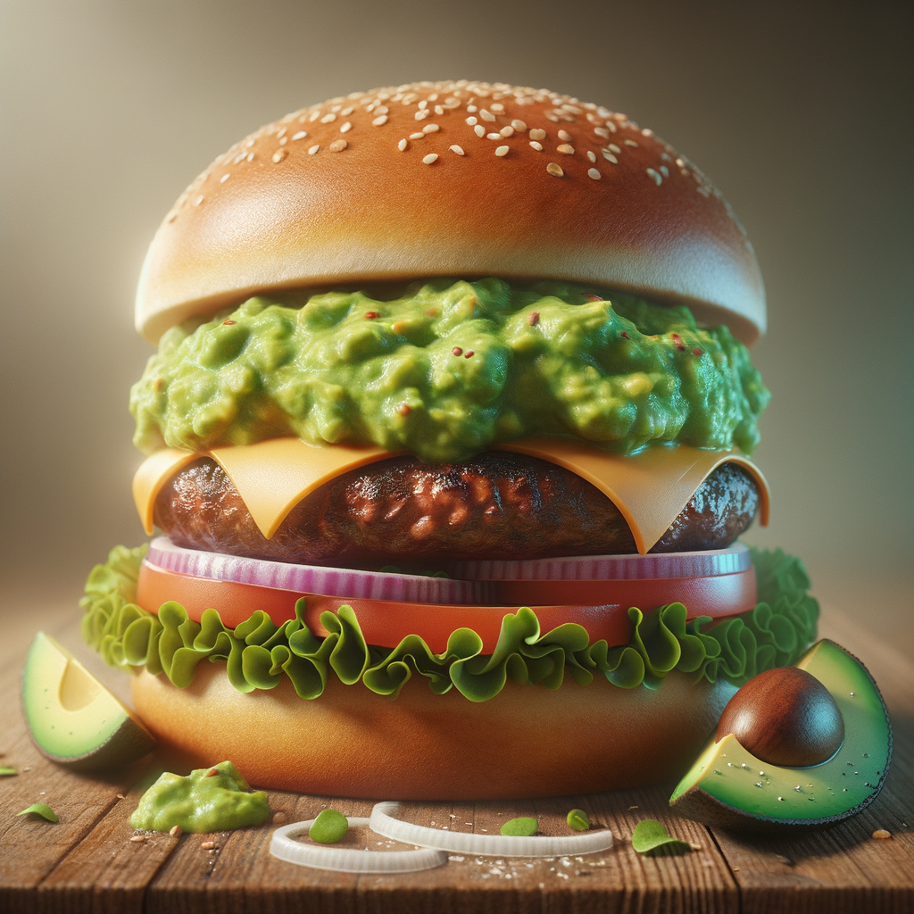 This char-grilled burger takes center stage with a dollop of rich guacamole, melted cheese, and the traditional lettuce, tomato, and onion, served on a toasted bun for a satisfying fusion of flavors.