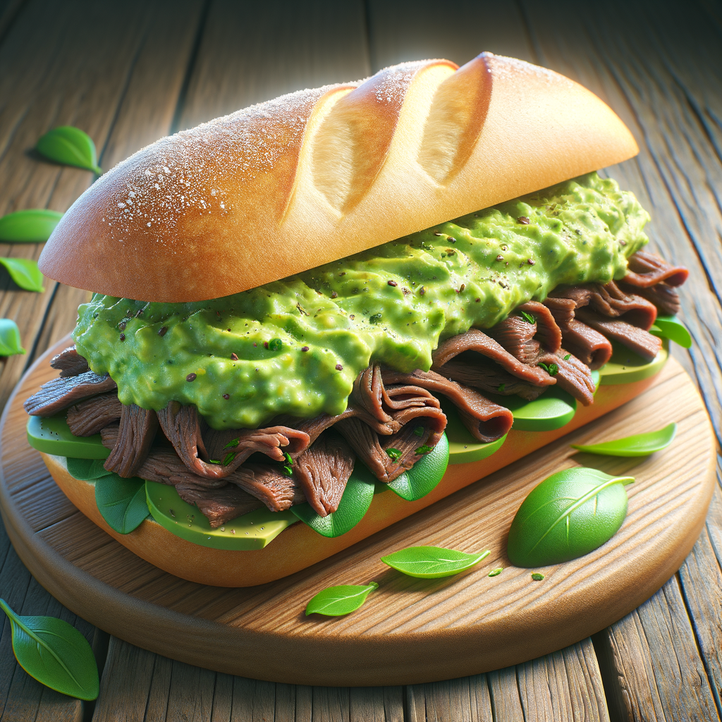 Portillo's signature Italian beef sandwich is enhanced with a creamy avocado spread, adding a rich and smooth texture to the thinly sliced beef, sweet peppers, and Italian seasonings, served on a toasted Italian roll.