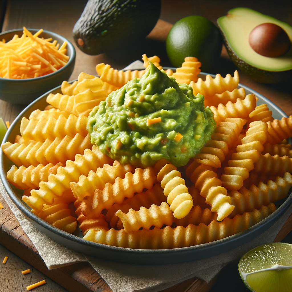 Crispy crinkle-cut fries seasoned with a signature spice blend, topped with a generous dollop of creamy guacamole and a sprinkle of sharp cheddar cheese, creating a perfect fusion of flavors.