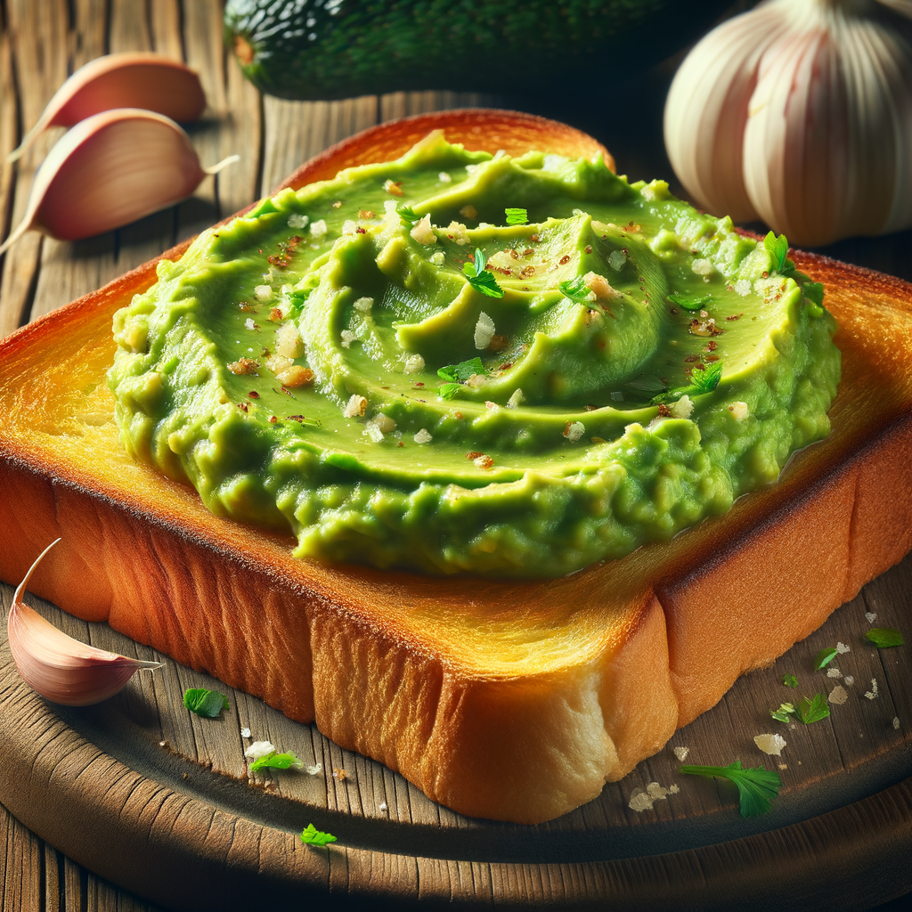 A slice of warm, buttery Texas toast topped with a luscious layer of freshly mashed avocado, a hint of garlic, and a light drizzle of lime juice, served as a zesty side or a delightful appetizer.