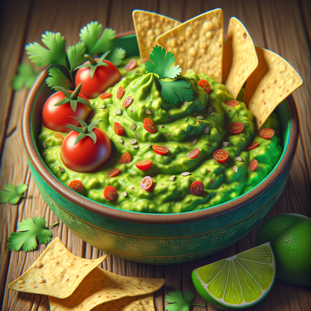 A vibrant bowl featuring creamy guacamole, topped with cherry tomatoes, cilantro, and lime zest. Served with crispy tortilla chips.