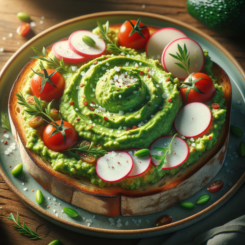 Toasted sourdough topped with a generous layer of smooth avocado mash, cherry tomatoes, radish slices, and a sprinkle of sea salt.