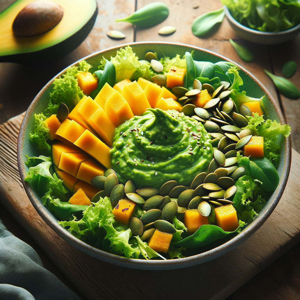 A refreshing salad with mixed greens, creamy avocado dressing, mango slices, and toasted pumpkin seeds.