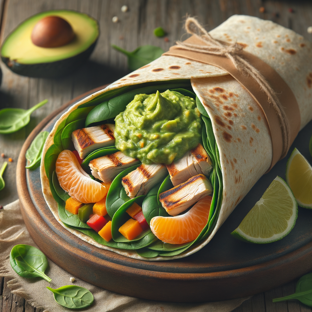 A whole wheat wrap filled with fresh spinach, grilled chicken strips, mandarin oranges, and crisp bell peppers, all brought together with a smooth avocado citrus dressing.