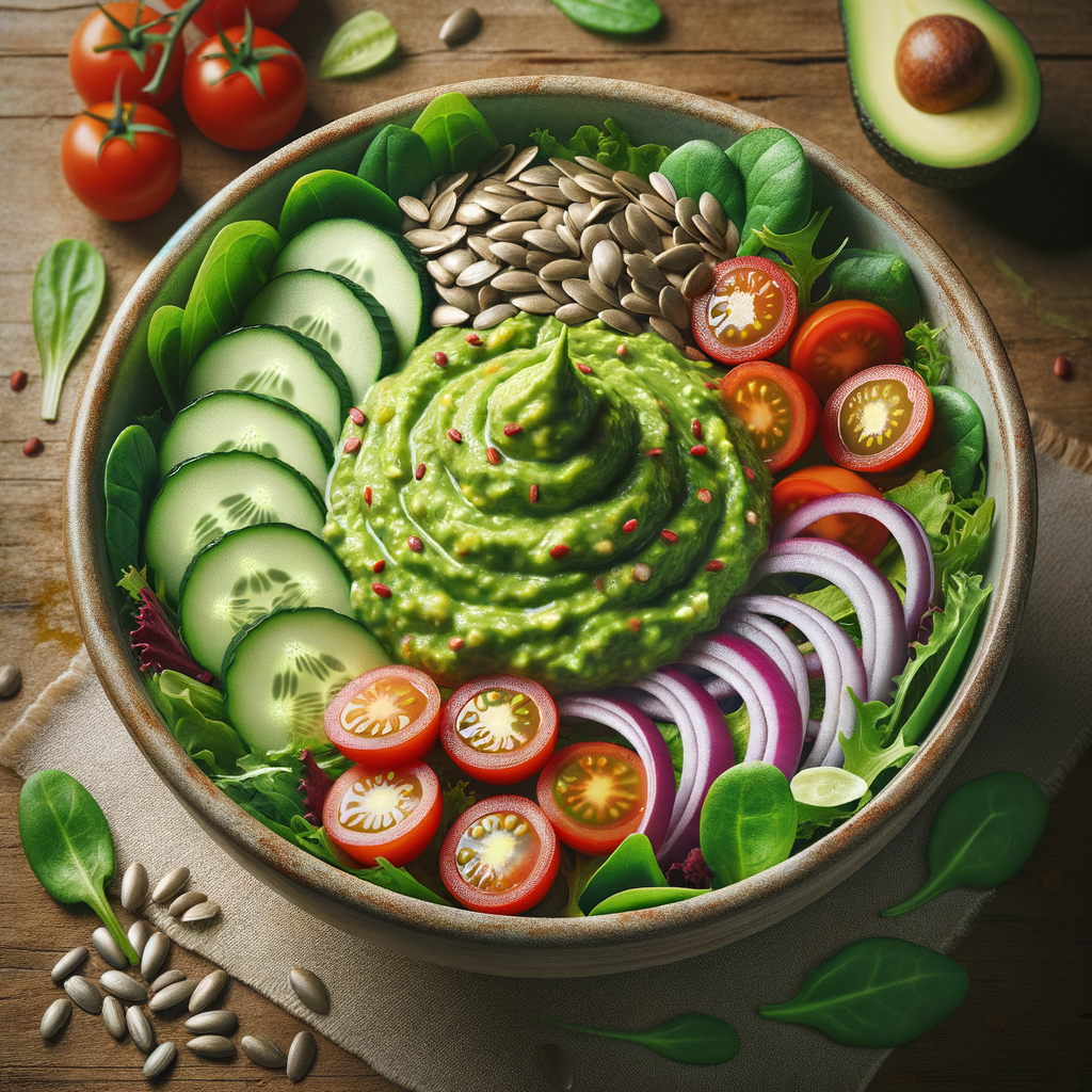 A nourishing bowl of mixed greens, cherry tomatoes, sliced cucumber, and red onion, topped with a generous dollop of zesty guacamole dressing. The bowl is garnished with roasted sunflower seeds for an added crunch.