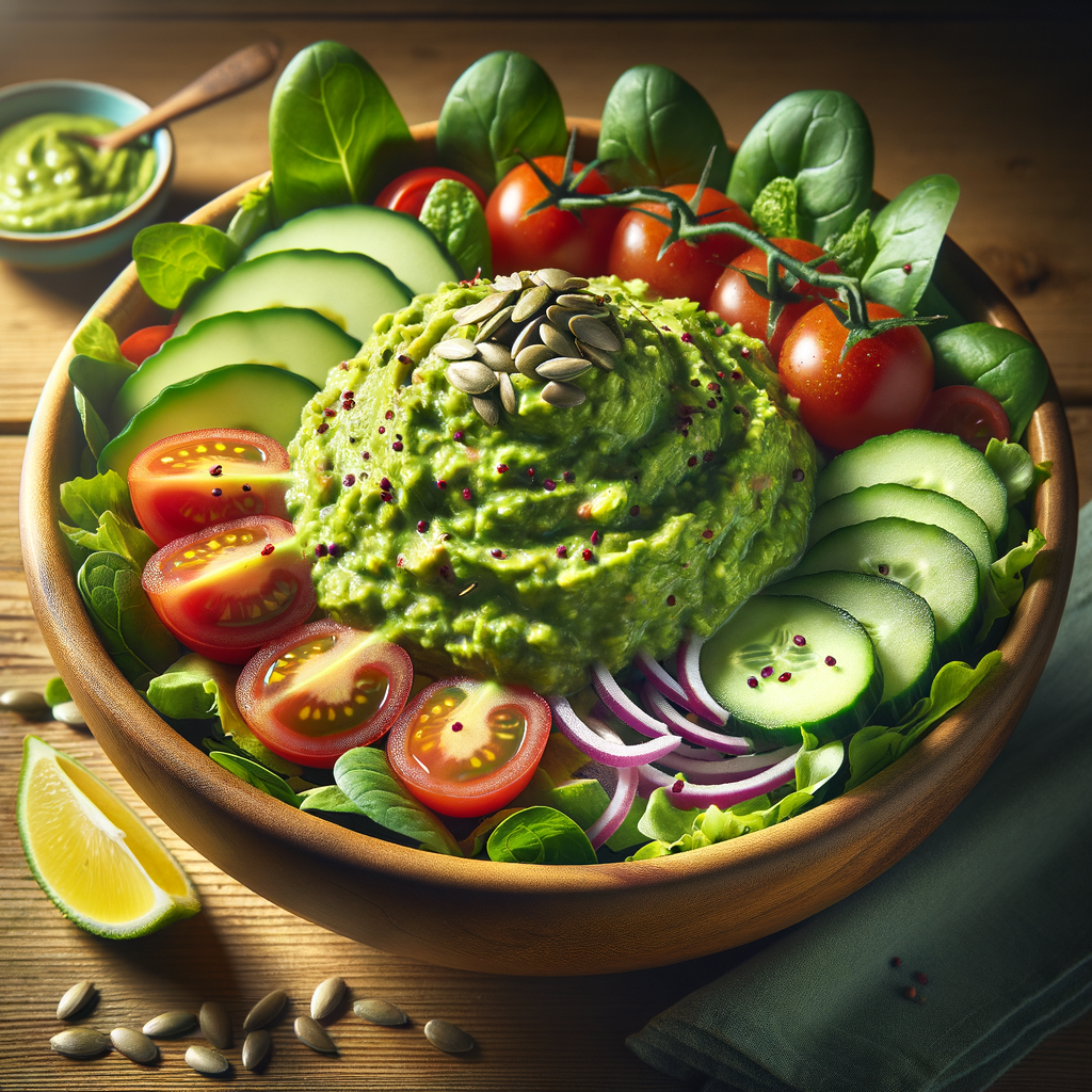 A nutrient-packed bowl featuring a bed of mixed greens, topped with a generous scoop of creamy guacamole, cherry tomatoes, diced cucumbers, red onions, and a sprinkle of sunflower seeds, served with a tangy lemon-avocado dressing on the side.