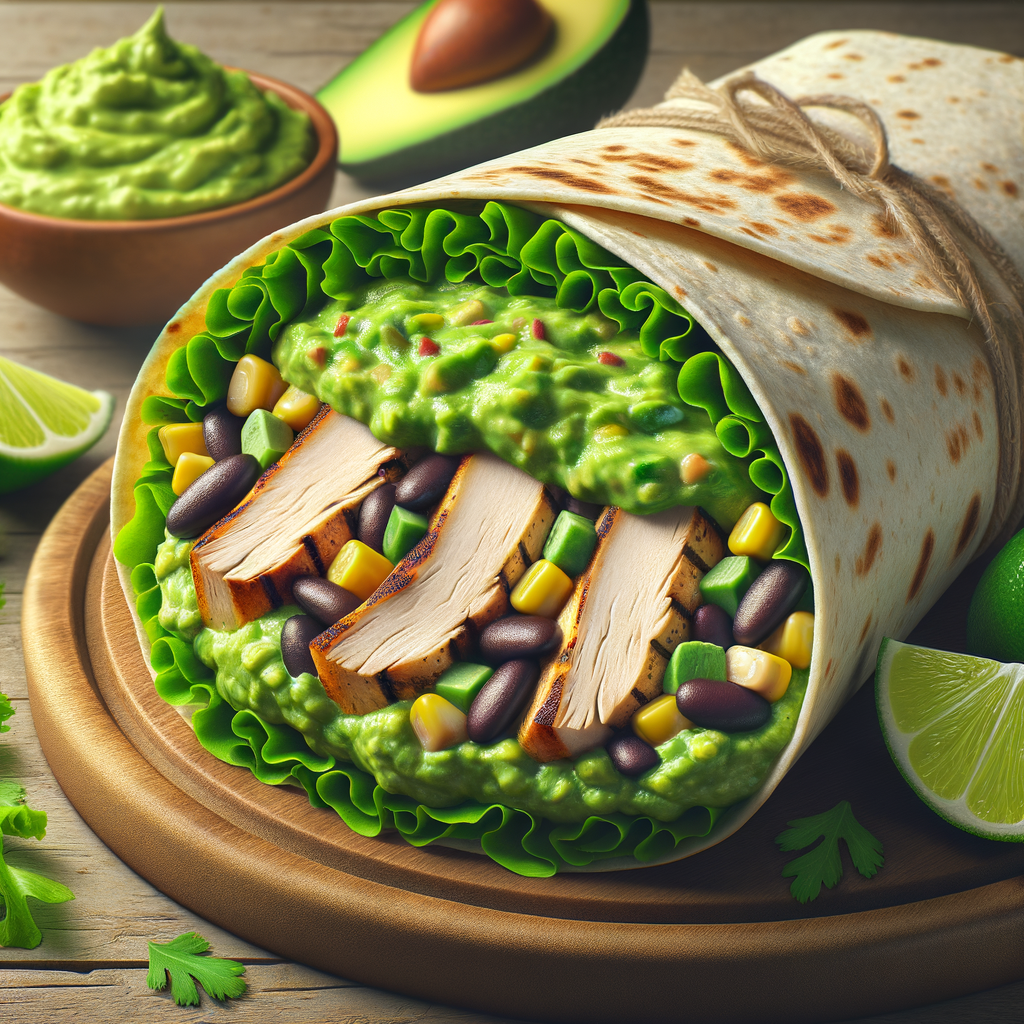 A hearty whole wheat wrap filled with sliced grilled chicken, black beans, corn, fresh romaine lettuce, and a spread of spicy guacamole, accompanied by a side of avocado-lime vinaigrette for dipping.