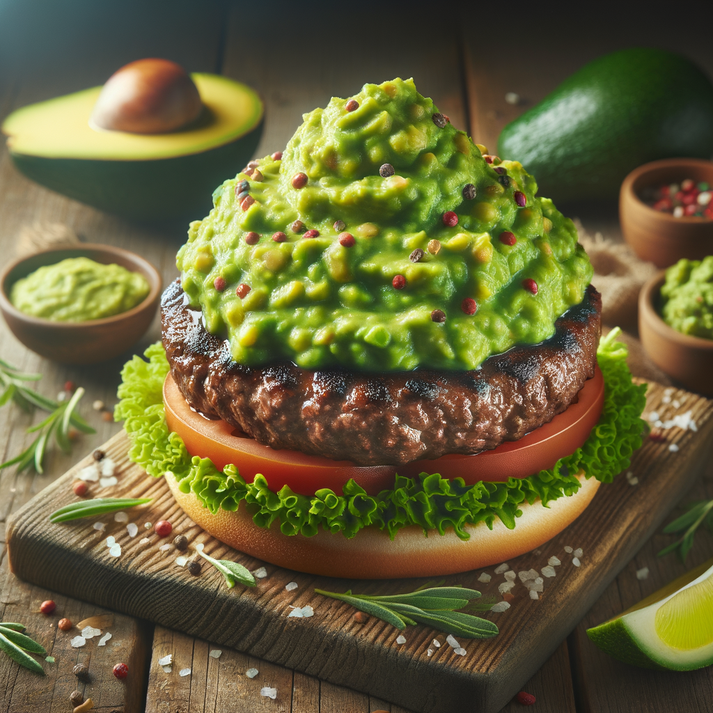 A juicy Angus beef burger topped with a generous layer of zesty guacamole, melted pepper jack cheese, fresh lettuce, and tomato, all nestled between toasted brioche buns. The guacamole adds a creamy texture and a punch of flavor that complements the savory beef patty.