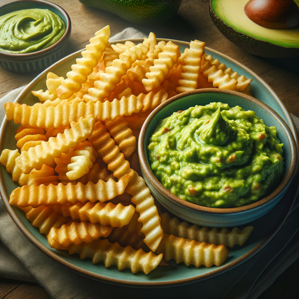 Crispy crinkle-cut fries served with a side of smooth, freshly mashed guacamole for dipping. The cool, creamy guacamole provides a perfect counterpoint to the hot, crispy fries, making for an irresistible side dish or snack.