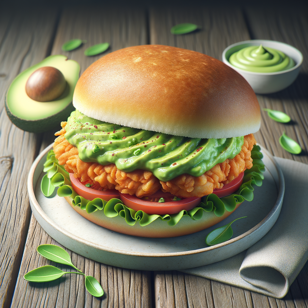 Crispy chicken sandwich elevated with a layer of smooth avocado dip, crisp lettuce, and a slice of ripe tomato, all enclosed in a fluffy potato roll.