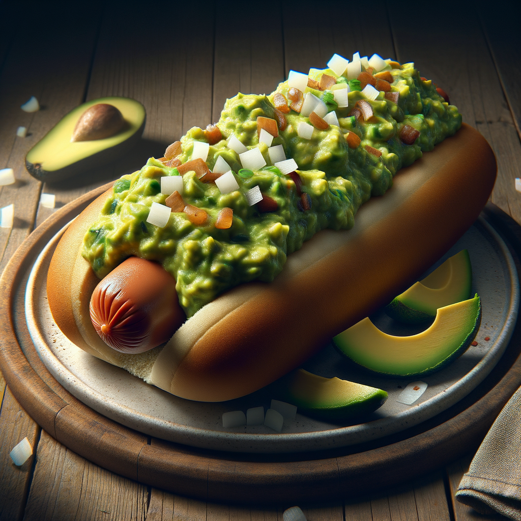 A signature flat-top hot dog with a twist, smothered in freshly made guacamole, diced onions, and a sprinkle of shredded cheese, served in a warm, toasted bun.