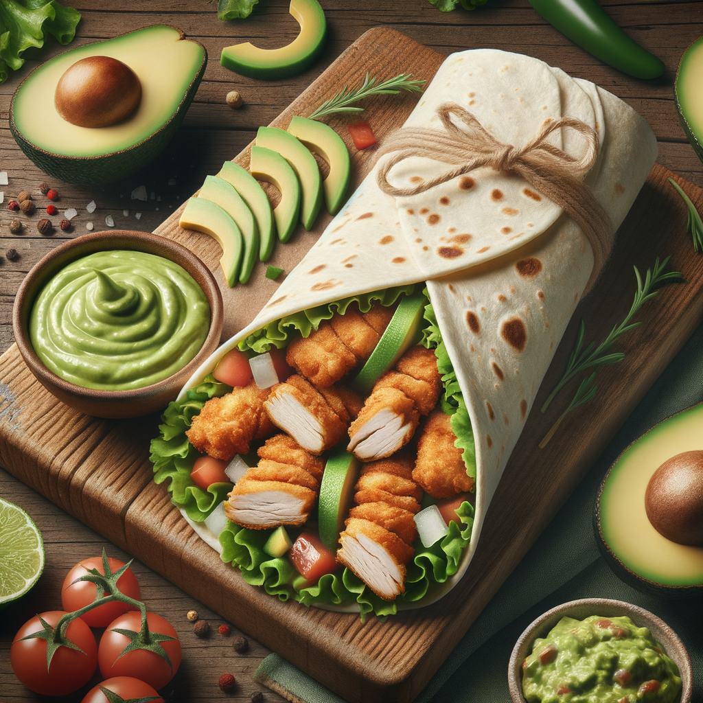 Tender crispy chicken strips wrapped in a soft flour tortilla with a smear of lush avocado dip, mixed greens, and diced tomatoes, offering a refreshing twist to the classic chicken wrap.