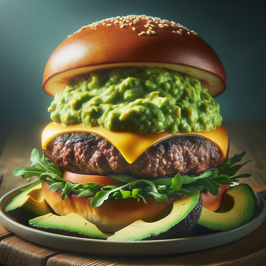 A succulent Angus beef patty topped with a generous layer of creamy guacamole, melted cheddar cheese, and fresh arugula, served on a toasted brioche bun. The guacamole adds a rich, smooth texture and a fresh, zesty flavor that perfectly complements the savory burger.