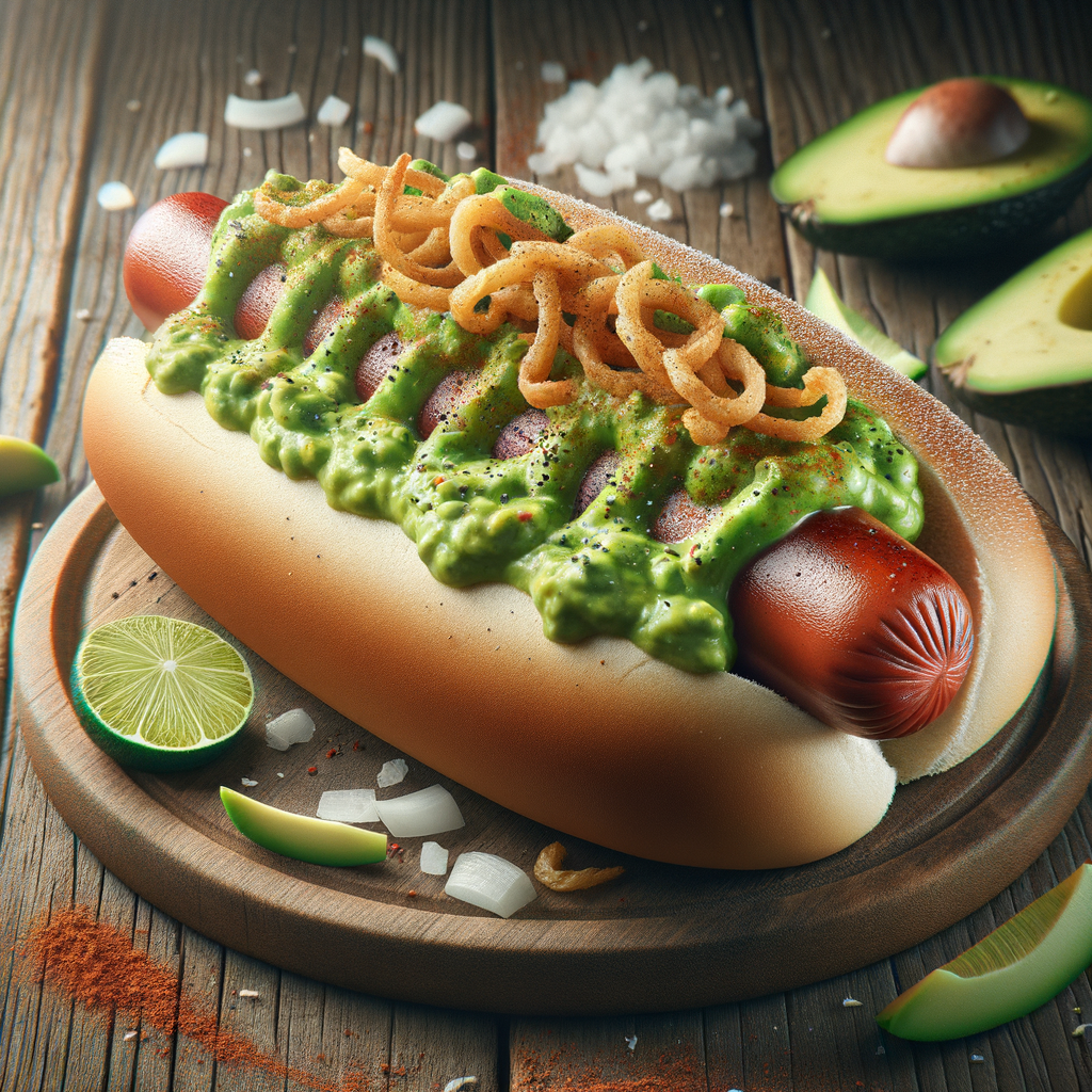 A classic flat-top grilled Vienna beef hot dog nestled in a soft bun, slathered with a rich avocado dressing, topped with crispy onions and a sprinkle of smoked paprika, adding a unique twist to the traditional hot dog.